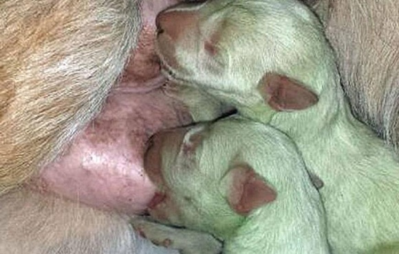 Σύμφωνα με τον κτηνίατρο που όπως είπε δεν έχει ξαναδεί κάτι παρόμοιο, το χρώμα ενδεχομένως να οφείλεται στην χολοπρασίνη, μια χημική ουσία που βρέθηκε στον πλακούντα της μητέρας τους. Ο παράδοξος χρωματισμός θα φύγει με το πέρασμα των ημερών.