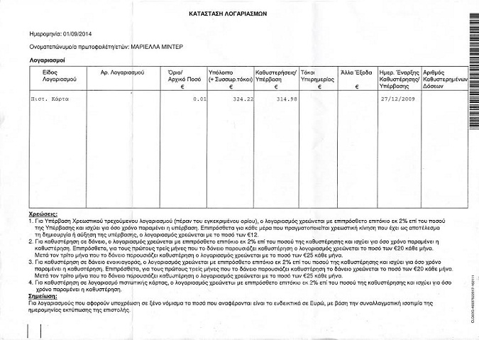 Τόκοι, χρεώσεις και λοιπά μετέτρεψαν ένα «χρέος» ύψους ενός λεπτού (0,01 ευρώ) σε 324 ευρώ και 22 λεπτά (324,22 ευρώ). Τράπεζα έστειλε μάλιστα επιστολή στην γυναίκα που χρωστούσε το ένα λεπτό και την απειλεί πως αν δεν πληρώσει τα 324 ευρώ θα την στείλει στο δικαστήριο.