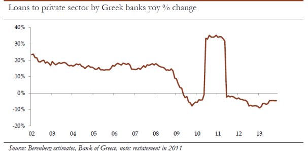 Μπορεί η Ελλάδα να έχει επιτύχει πρωτογενές πλεόνασμα το όποιο θα φτάσει το 1,5% το 2014, από την άλλη πλευρά όμως, δεν προχώρησαν οι διαρθρωτικές αλλαγές, δεν υπάρχει ατζέντα που να πείθει τις αγορές και η οικονομική σταθερότητα απειλείται από τον κοινωνικό και πολιτικό παράγοντα. Εάν διεξαχθούν, μάλιστα, εκλογές στην Ελλάδα το 2014, η πρόοδος της ελληνικής οικονομίας μπορεί να ανασταλεί επηρεάζοντας αρνητικά τις τράπεζες.