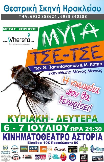 Άλλη μία παράσταση από την Θεατρική Σκηνή Ηρακλείου και τον Μάνο Μανιά αναμένεται να κάνει πρεμιέρα στο Κινηματοθέατρο Αστόρια του Ηρακλείου την Κυριακή 6 και δευτέρα 7 Ιουλίου 2014. Πρόκειται για την παράσταση "Μύγα Τσετσέ" που διασκεύασαν μοναδικά οι Μιχάλης Ρέππας και Θανάσης Παπαθανασίου. Η παράσταση αρχίζει στις 21.30 το βράδυ και σας υπόσχεται άφθονο γέλιο και στιγμές χαλάρωσης.