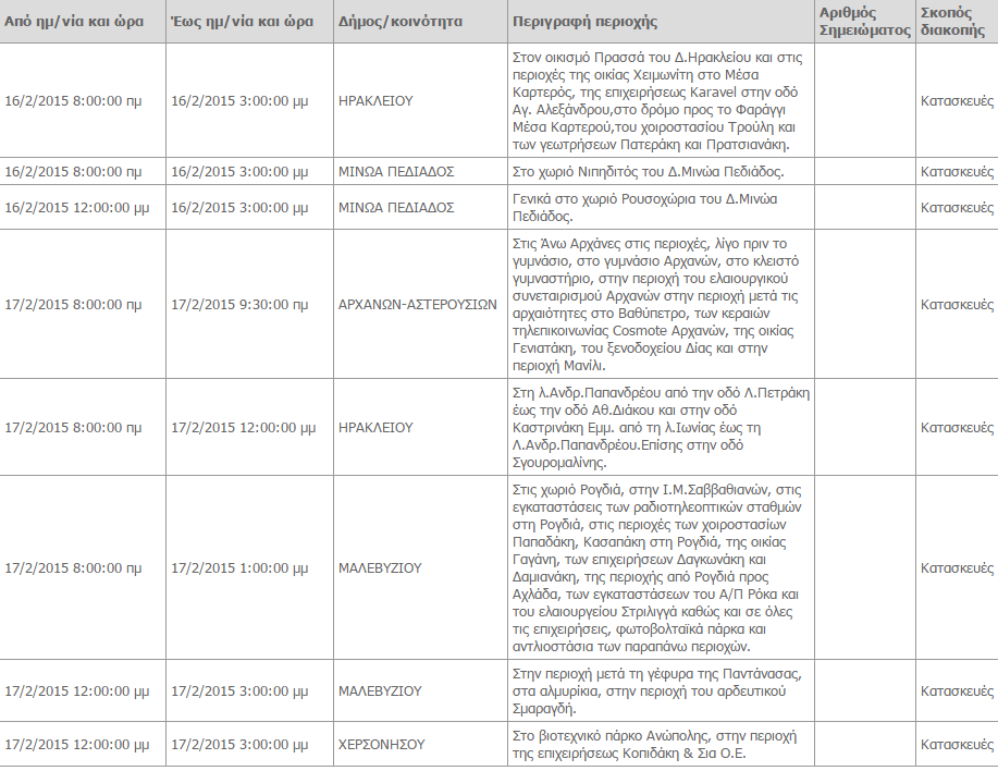Δείτε στον παρακάτω πίνακα αναλυτικά, τις προγραμματισμένες διακοπές ρεύματος στο Νομό Ηρακλείου, έτσι όπως αναρτηθεί στο πρόγραμμα του ΔΕΔΗΕ.