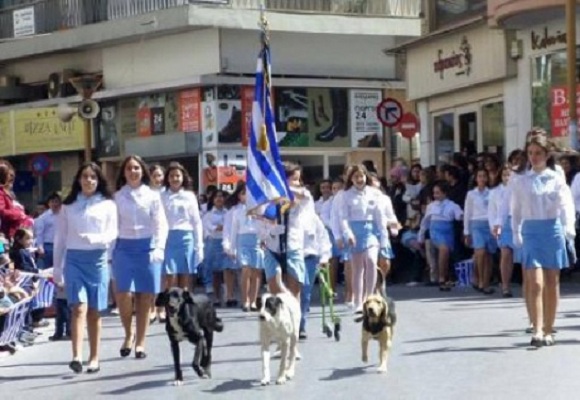 Τρία σκυλάκια παρελαύνουν μαζί με τους μαθητές και προηγούνται της σημαιοφόρου. Σύμφωνα με αυτόπτες μάρτυρες, τα τρία αδέσποτα σκυλάκια έδιναν το βήμα στην παρέλαση αφού καθ' όλη τη διάρκεια βρίσκονταν μπροστά, σε σταθερή απόσταση, από τα παιδιά, αναφέρει το newsbomb.