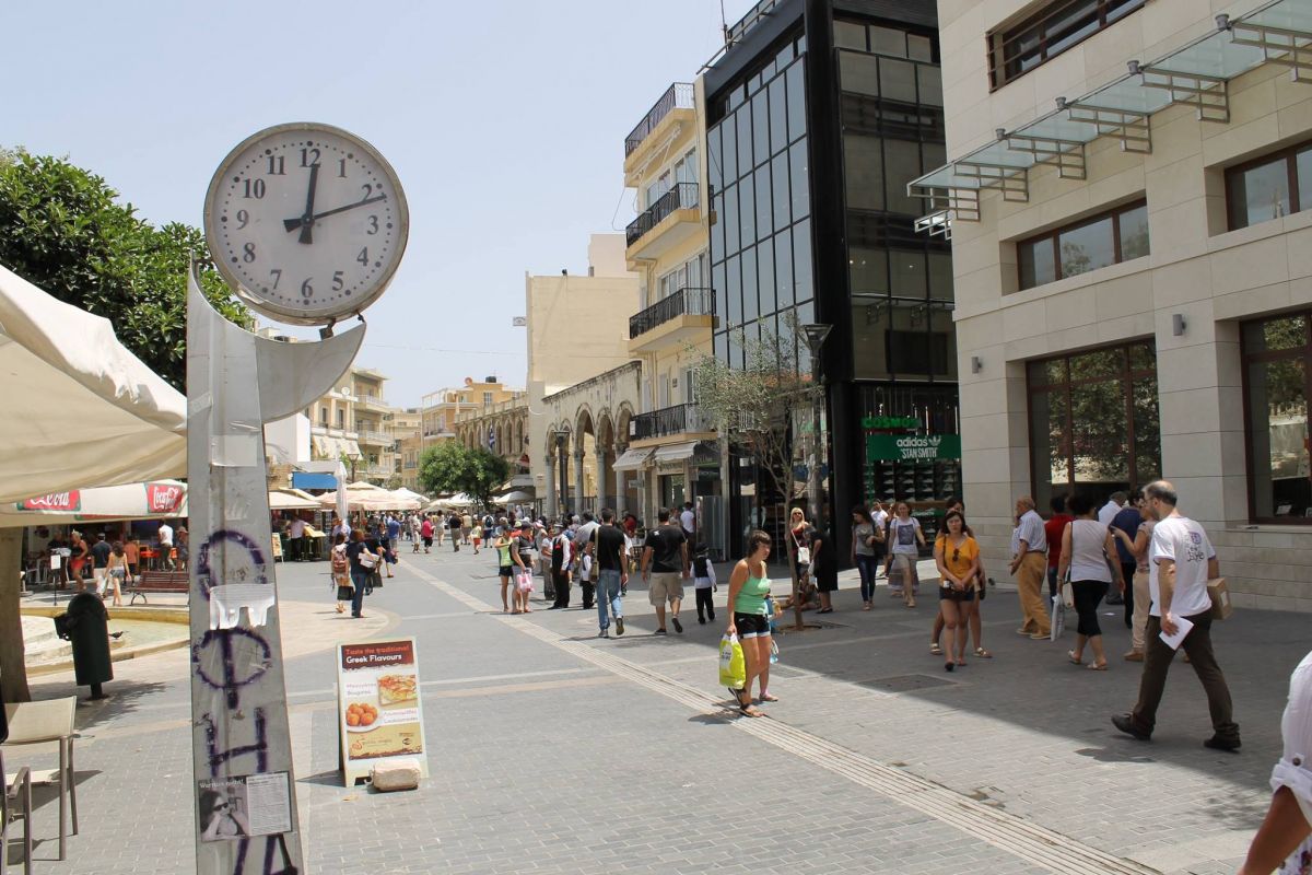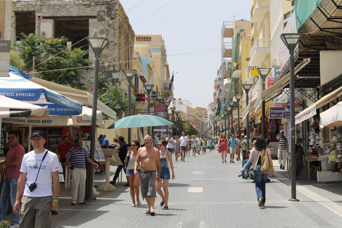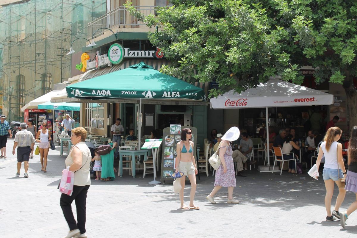 Και η οδός 25ης Αυγούστου είχε κίνηση, με πρωταγωνιστές ξένους επισκέπτες της πόλης, οι οποίοι είναι άμαθοι στην πολλή ζέστη, έβγαλαν τις μπλούζες και απολάμβαναν τη βόλτα τους, σε μία από τις πιο όμορφες περιοχές του Ηρακλείου...