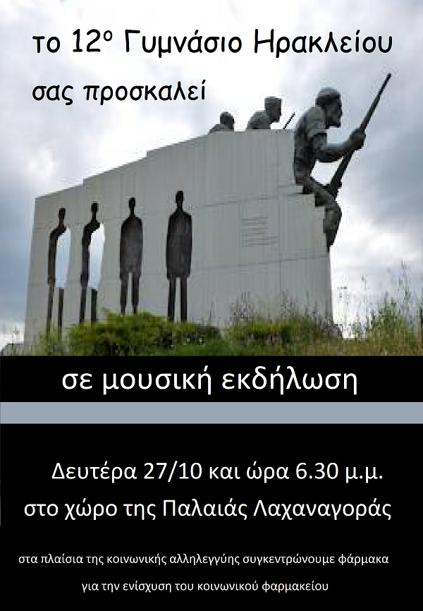 Επίσης το σχολείο οργανώνει τη Δευτέρα 27/10 στις 6.30 μ.μ. στο χώρο της Παλαιάς Λαχαναγοράς, μουσική εκδήλωση με αφορμή την επέτειο της 28ης Οκτωβρίου. Προαιρετικά και στο πλαίσιο της κοινωνικής αλληλεγγύης συγκεντρώνουν φάρμακα, για την ενίσχυση του κοινωνικού φαρμακείου.