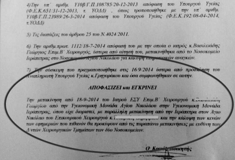 Η απόφαση του Διοικητή των Διασυνδεδεμένων Νοσοκομείων κ. Μανόλη Μακρονικολάκη με ημερομηνία 17 Σεπτεμβρίου αναφέρει πως μετά τη σύσκεψη που έγινε την προηγούμενη μέρα στο Υπουργείο Υγείας, ο Διοικητής αποφασίζει και εγκρίνει τη μετακίνηση του Επιμελητή Β΄ χειρουργού από το Νοσοκομείο Αγίου Νικολάου στο Νοσοκομείο Ιεράπετρας, με παράλληλη μετακίνηση από την Ιεράπετρα του Επικουρικού Χειρουργού και την κάλυψη των κενών των εφημεριών που θα προκύψουν από τις μετακινήσεις αυτές από τους Διευθυντές των χειρουργικών τμημάτων των δύο Νοσοκομείων.