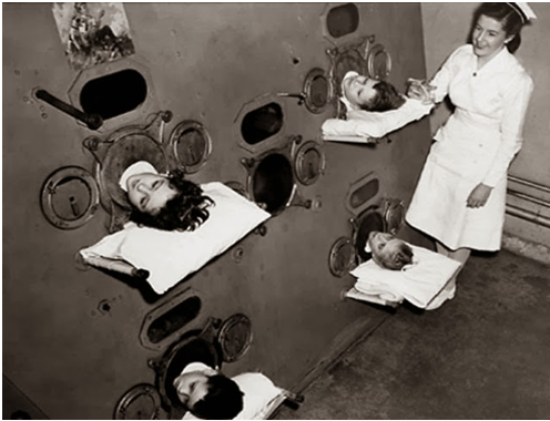 Παιδιά με πολιομυελίτιδα μέσα σε σιδηρούν πνεύμονα, που υποβοηθά τη λειτουργία των πνευμόνων, το 1937.