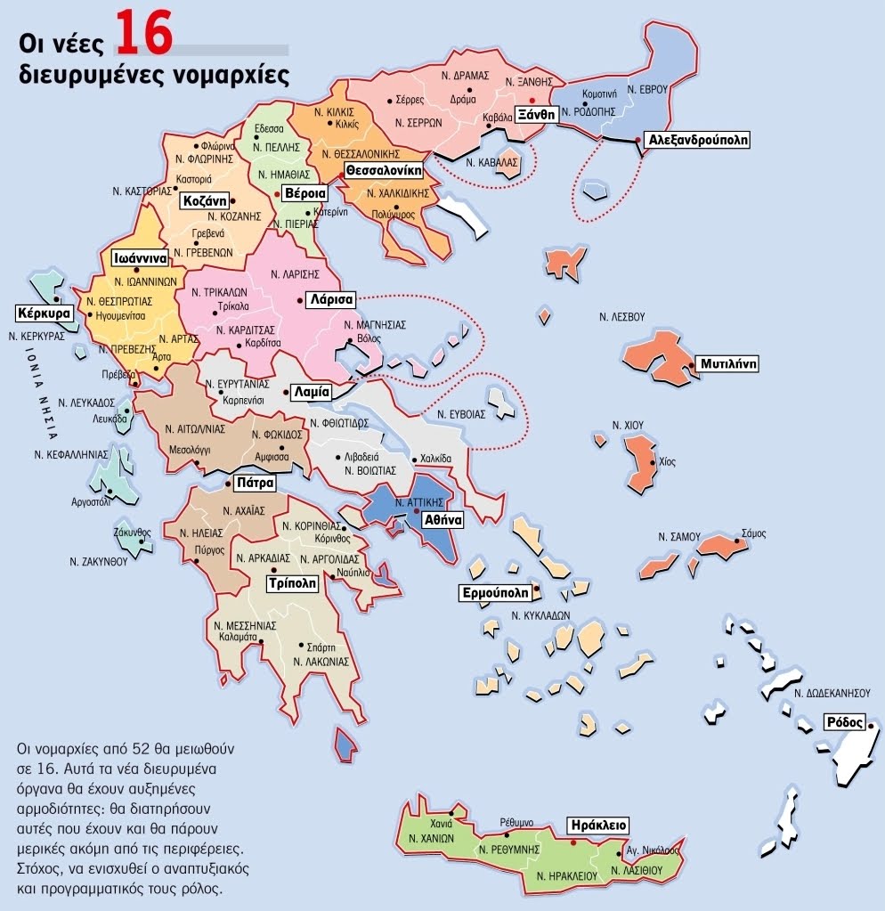 Το 1836, οι νομοί καταργήθηκαν και η επικράτεια χωρίστηκε σε 30 διοικήσεις και σε 19 υποδιοικήσεις. Επανήλθαν όμως το 1845 με τη διαφορά ότι οι επαρχίες αυξήθηκαν σε 49. Από τότε έγιναν πολλές αλλαγές και σήμερα οι νομοί φτάνουν τους 52 με μεγαλύτερο σε έκταση εκείνου της Αιτωλοακαρνανίας και με μικρότερο σε έκταση εκείνον της Λευκάδας.