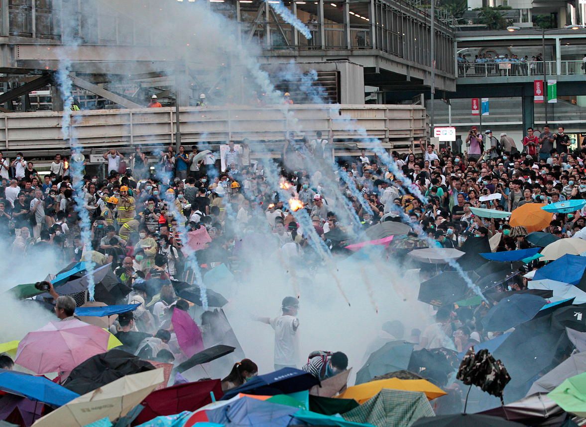 Οι διαδηλώσεις, κατά τις οποίες δεκάδες χιλιάδες άνθρωποι βγήκαν στους δρόμους για να ζητήσουν από το Πεκίνο περισσότερες πολιτικές ελευθερίες, πήραν βίαιη τροπή χθες, Κυριακή, όταν η αστυνομία έκανε άφθονη χρήση αερίου πιπεριού και δακρυγόνων για να προσπαθήσει να τις διαλύσει.