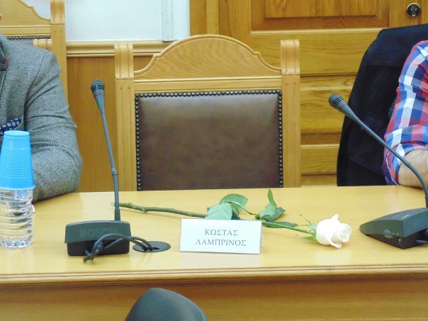 Μάλιστα η θέση του Κώστα Λαμπρινού έμεινε συμβολικά κενή, με ένα τριαντάφυλλο πάνω στο έδρανο.