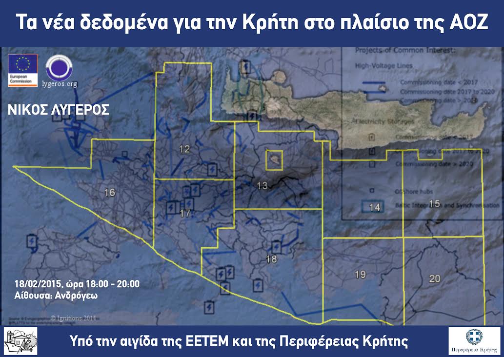 «Τα νέα δεδομένα για την Κρήτη στο πλαίσιο της ΑΟΖ» είναι το θέμα εκδήλωσης με κεντρικό ομιλητή τον στρατηγικό σύμβουλο Νίκο Λυγερό που οργανώνεται από την Ε.Ε.Τ.Ε.Μ Ηρακλείου (Επαγγελματική Επιστημονική Ένωση Τεχνολογικής Εκπαίδευσης Μηχανικών) με την αιγίδα της Περιφέρειας Κρήτης.