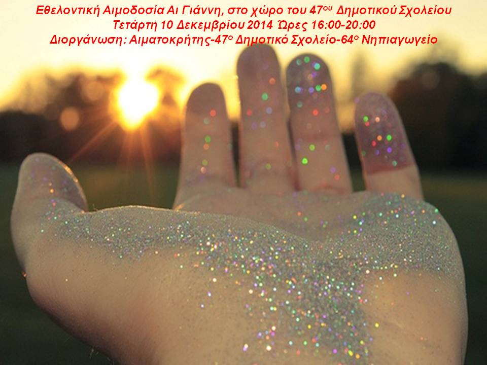 Εθελοντική Αιμοδοσία θα πραγματοποιήσει ο Παγκρήτιος Σύνδεσμος Εθελοντών Αιμοδοτών "Αιματοκρήτης" σε συνεργασία με το 47ο Δημοτικό και το 64ο Νηπιαγωγείο Ηρακλείου, την Τετάρτη 10 Δεκεμβρίου 2014 στο χώρο του 47ου Δημοτικού Σχολείου Ηρακλείου (οδός Κρασαδάκη 19, Άγιος Ιωάννης) και ώρες 16:30-19:30.