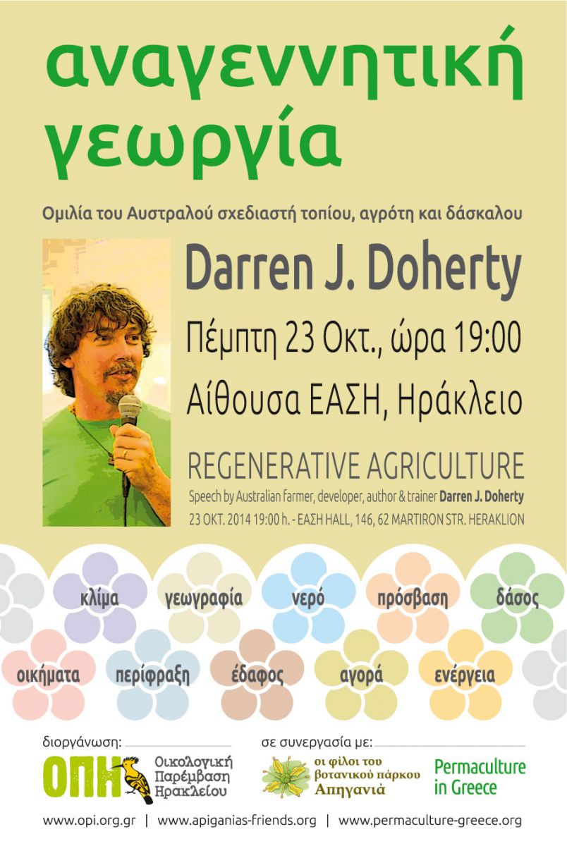 Ο Αυστραλός σχεδιαστής τοπίου, αγρότης και δάσκαλος Ντάρεν Ντόχερτυ σε ανοιχτή ομιλία με θέμα την Αναγεννητική Γεωργία στην αίθουσα της ΕΑΣΗ στο Ηράκλειο, την Πέμπτη 23 Οκτωβρίου στις 7 το βράδυ. Την εκδήλωση διοργανώνει η Οικολογική Παρέμβαση Ηρακλείου.