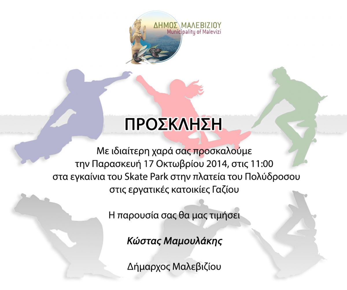 Ένα πρωτότυπο έργο ολοκληρώθηκε στο δήμο Μαλεβιζίου και συγκεκριμένα στις εργατικές κατοικίες Γαζίου με τα εγκαίνια του να πραγματοποιούνται την Παρασκευή 17 Οκτωβρίου και ώρα 11:00. Ο λόγος για το skate park που αποτελεί έναν ιδιαίτερο χώρο διασκέδασης, διαθέτει ειδικό εξοπλισμό πίστας skate board και χώρο στάθμευσης ποδηλάτων ενώ παράλληλα υλοποιήθηκαν έργα για το φωτισμό, τις φυτεύσεις και την εγκατάσταση δικτύου άρδευσης πίστας Skate Board.